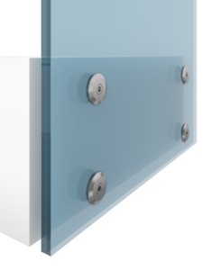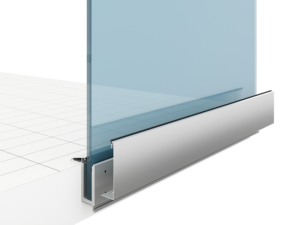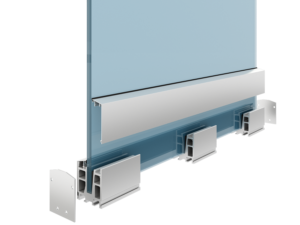Sistemul de susținere a panourilor de sticlă cu fixare pe podea, fiind din aluminiu, conferă un aspect deosebit prin contrastarea puternică cu fragilitatea aparentă a sticlei.